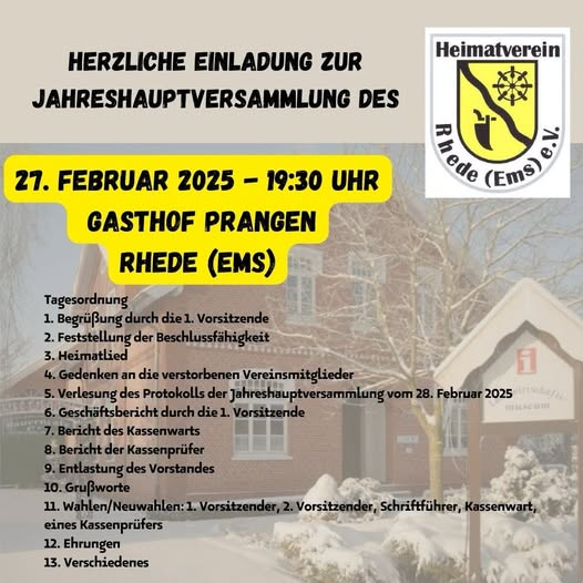 wir möchten Euch herzlich zu unserer diesjährigen Jahreshauptversammlung am Freitag, den 27. Februar 2025 um 19.30 Uhr im @gasthofprangen in Rhede (Ems) einladen.